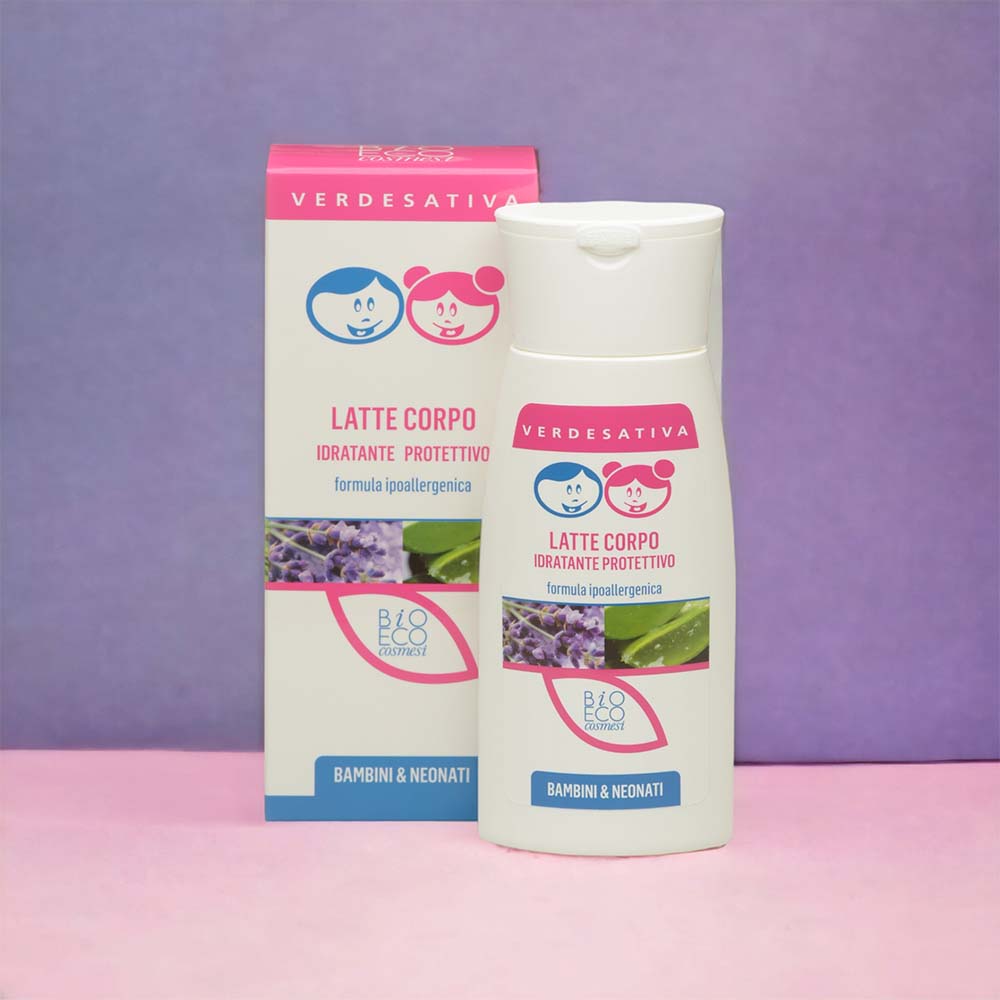 Lozione adatta per la cura quotidiana della pelle sensibile dei bambini e come emulsione idratante e protettiva post-bagnetto e come doposole.
